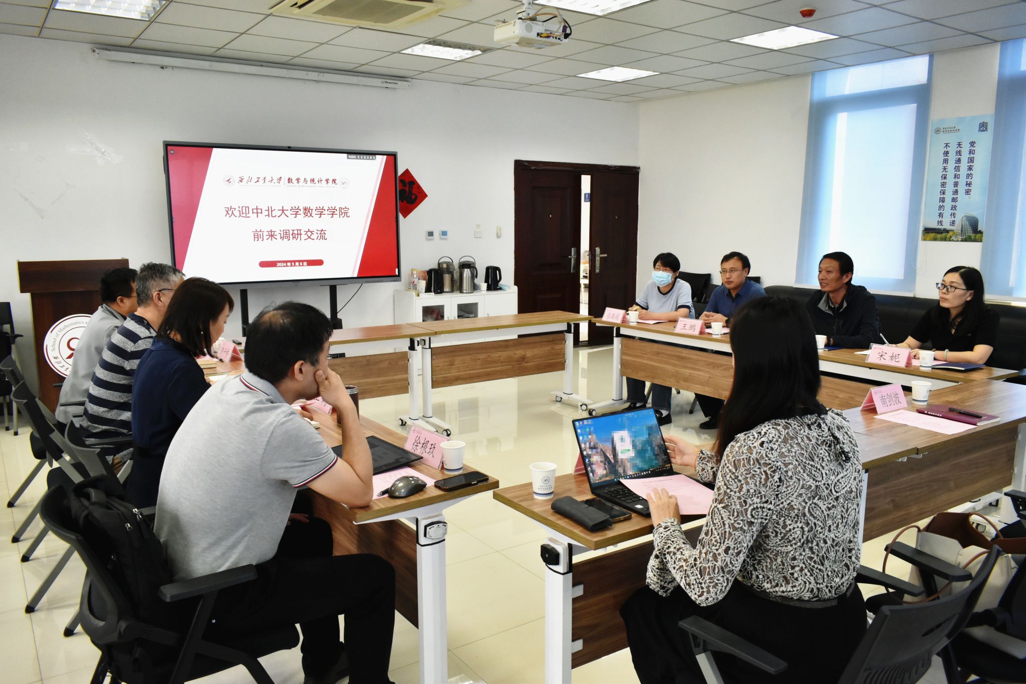 聂玉峰从公司历史沿革、团队概况、数学拔尖人才和“总师型”人才培养、科学研究、国际合作等方面做了重点介绍,王莉就公司近几年取得的党建成果分享了工作的开展思路和经验方法。薛亚奎介绍了中北大学数学公司发展历程、专业建设、团队状况、人才引进等方面的情况。双方围绕党建工作、数学团队建设、人才培养等方面进行了深入细致的交流。