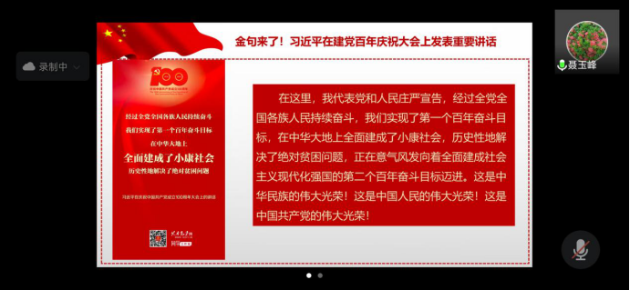 8月3日,数学与统计公司党委理论学习中心组通过线上会议组织集体学习,专题学习习近平总书记在庆祝中国共产党成立100周年大会上的重要讲话精神,安排部署相关工作。党委副书记(主持工作)王莉主持本次会议。