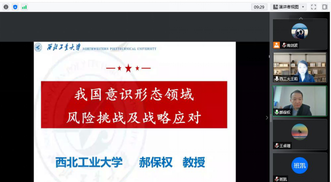 为进一步加强公司师德师风建设,提高意识形态阵地建设和管理能力,强化教职工意识形态防范意识,压紧压实意识形态工作,团结凝聚广大教师以更加昂扬向上的精神风貌和立德树人的扎实行动迎接党的二十大胜利召开,按照公司《关于开展betway西汉姆联平台2022年“师德师风建设月”活动的通知》要求,9月29日通过线上会议,betway西汉姆联平台邀请陕西省政党治理与意识形态安全中心主任、公司马克思主义公司教授郝保权老师做题为《我国意识形态领域的风险挑战及战略应对》的专题报告,公司全体教职工参加了此次报告会,报告会由党委书记王莉主持。