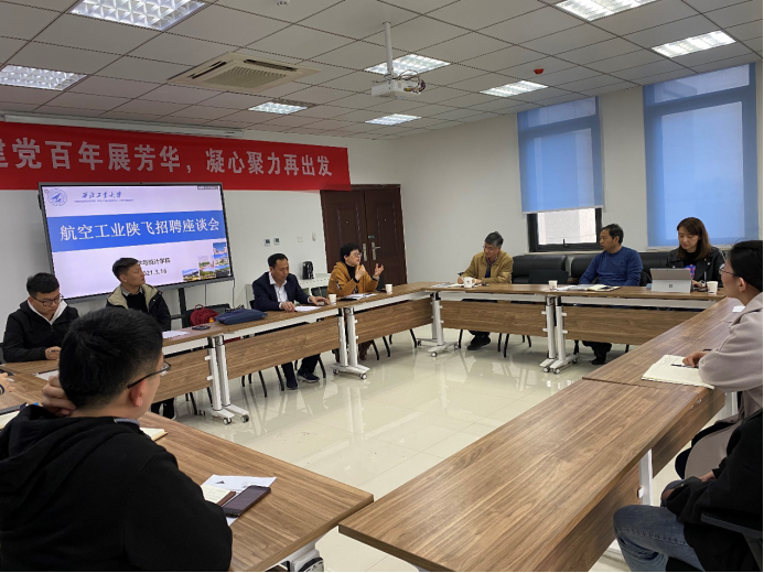 2021年3月16日下午,航空工业陕西飞机工业有限责任公司赴公司开展招聘座谈会,陕飞公司人力资源部/党委组织部部长张海琪,人力资源部人事处处长杨怀斌,人力资源部人事招聘主管郑椿怀,设计研究院主管设计李昌凡;betway西汉姆联平台经理聂玉峰,党委副书记张莹,张胜贵教授,辅导员王刚,兼职辅导员王悦欣、刘鹏及2021届毕业生代表等相关人员参加了此次座谈。