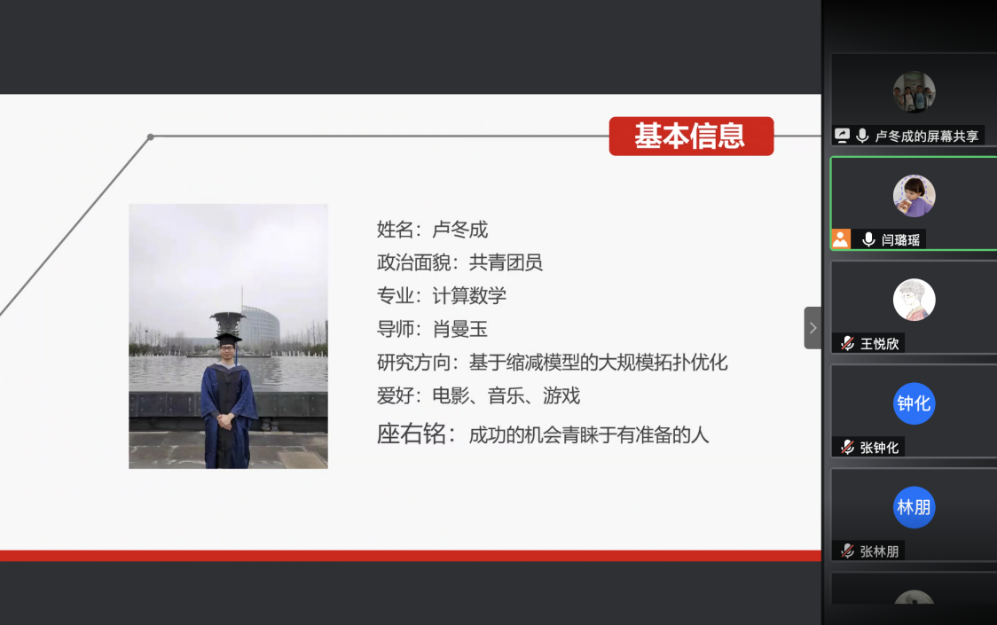 卢冬成围绕着学习科研和日常生活两个方面展开阐述。回想起自己一开始踏上科研之路,面对着陌生的科研内容和突然转变的学习节奏,一度陷入过彷徨与迷惘之中,一时难以把握奋斗的目标和方向。但是在导师的悉心指导和同学们的殷切鼓励下,以及在个人的不断尝试、努力、适应和改变下,积累起了研究经验,并渐渐地从对知识的单纯学习者蜕变为领域内的开拓创新者,最终得以冲破科研的迷雾。最后,卢冬成希望各位学弟学妹们不负韶华、脚踏实地、带着“会当凌绝顶,一览众山小”的豪气勇攀科研高峰,为公司和公司争光添彩!