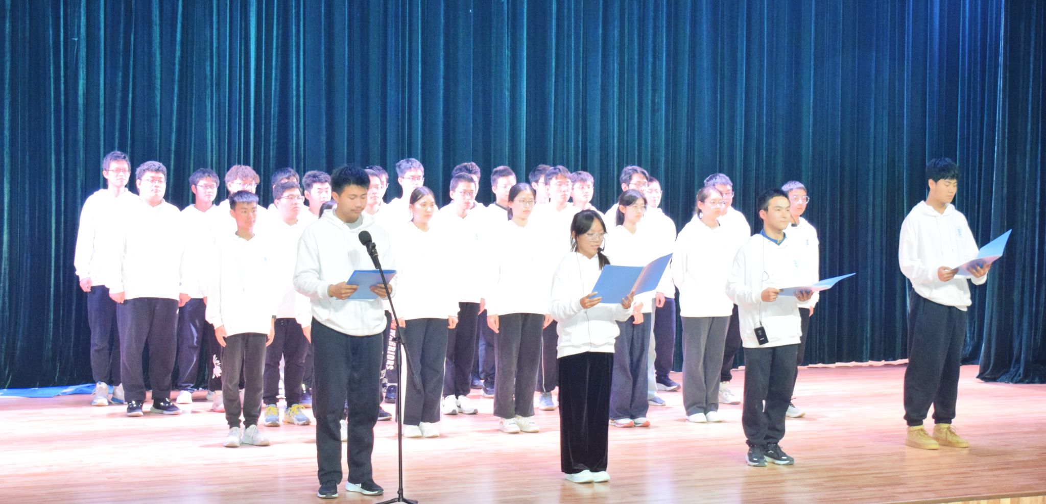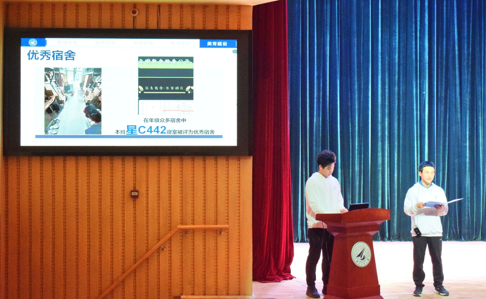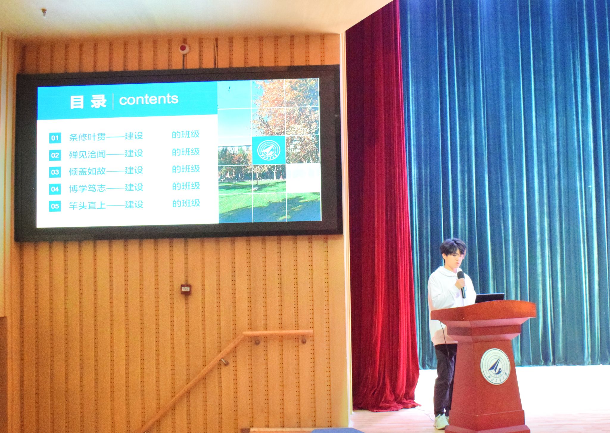 比赛当天,入选班级彩排有序,全情投入,为踏上舞台做好了充足准备。主持人班凯介绍了大赛相关内容及年级组织情况,班主任代表乔艳宣读了比赛规则及评选办法。随后,参赛的三个班级按照抽签顺序依次上台进行班级文化建设成果汇报和班级风采展示。