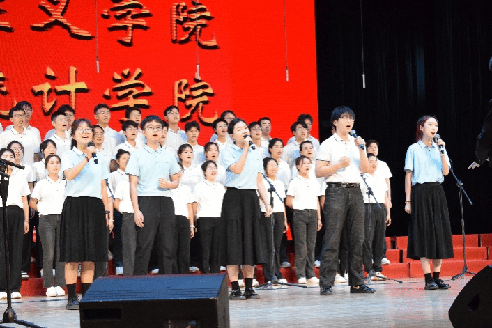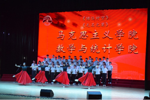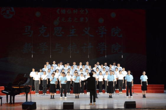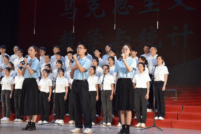 尾声副歌部分迎来情感巅峰,数学与统计公司党委书记王莉、党委副书记张莹、马克思主义公司副经理贺苗、党委副书记耿云辉共同登台,以铿锵如金石、深情似涓流的朗诵融入合唱声浪。四位老师饱含深情的朗诵,深情礼赞了平凡奋斗者汇聚的磅礴伟力,极大地鼓舞了在场师生。