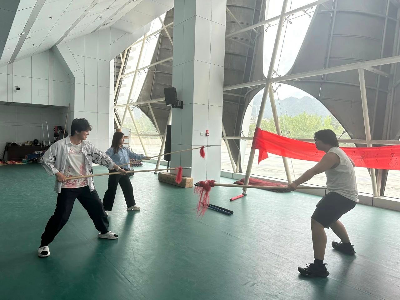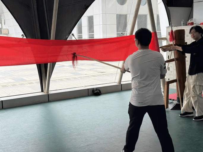 遨游过武术文化的海洋,紧接着就是“破空箭”——精准扎枪环节。在工作人员的悉心指导下,同学们认真学习,反复模仿练习,将手中的武器操纵自如,成功完成了圈内精准扎枪的项目,获得了工作人员的好评。