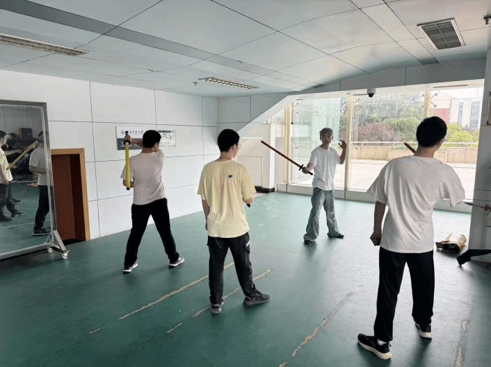 体验过扎枪,“锋芒炼”——短兵教学与实践环节自然必不可少。在工作人员的指导下,同学们深入学习劈、砍、斩、刺这些武术动作,在场地中挥举自如,其中的一招一式尽显武林风采。