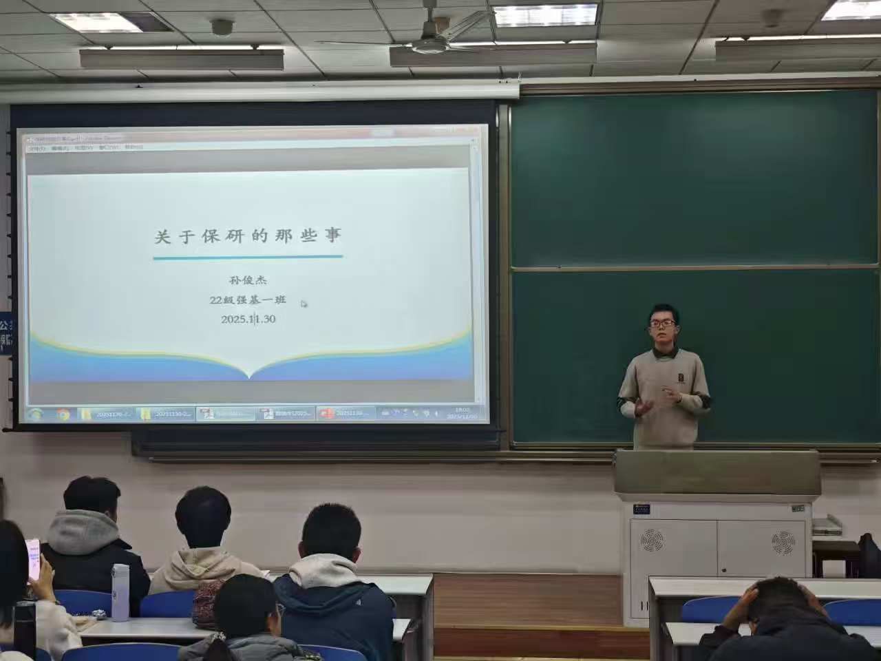 2022级本科生孙俊杰系统解读学业进阶与保研规划,以“学术进阶路径与规划”为主题,系统梳理了保研政策的核心要点,包括成绩排名、必修课程与科研经历的要求。他强调,基础课程成绩是核心竞争力,提醒新生从大一开始稳扎稳打,并建议处于保研资格边缘的同学做好“两手准备”。