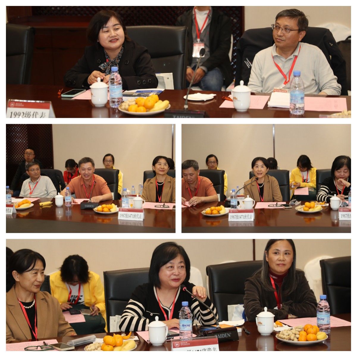 会上,1992级员工代表史亚玲、1987级员工代表张宇宏、1997级员工代表朱道刚、1999级员工代表燕斐、2011级员工代表徐立扬、2017级员工代表杜若琳向各自求学期间所在年级的班主任、辅导员、任课教师代表张雪霞、张凯院、欧阳洁、彭国华、台炳龙、王莹等六位教师献上花束,表达尊师重道之情,场面温馨感人。