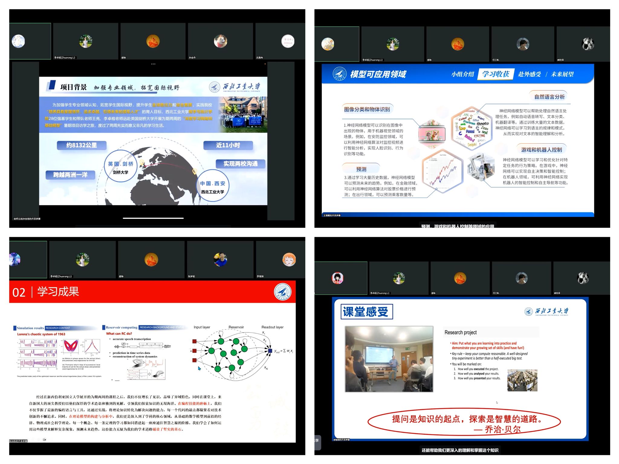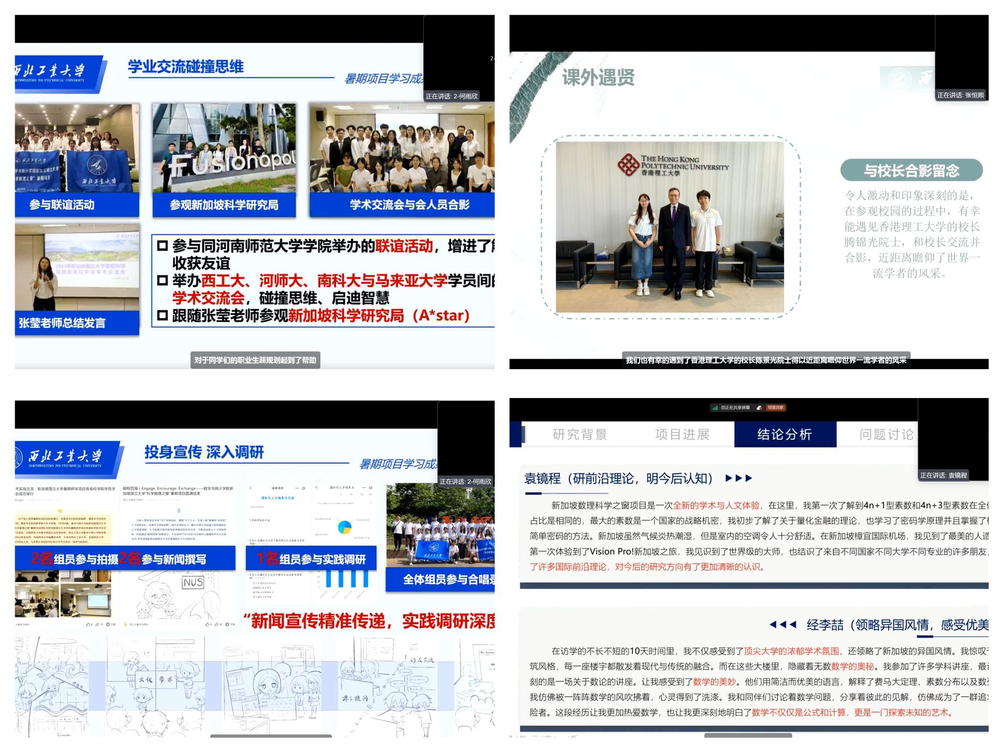 答辩过程中,11支小组依次对各自的暑期研学项目进行了全面展示。从小组的基本情况到学习心得,再到文化体验与实践收获,员工们多角度地分享了国际访学的成果与感悟。随后,77名个人答辩者也从个人学习经历、项目感受及未来规划等多个方面生动展现了他们的成长与收获。科学与文化交融,历史与现实碰撞,展现出了西工大学子心怀家国、放眼世界的全球视野。