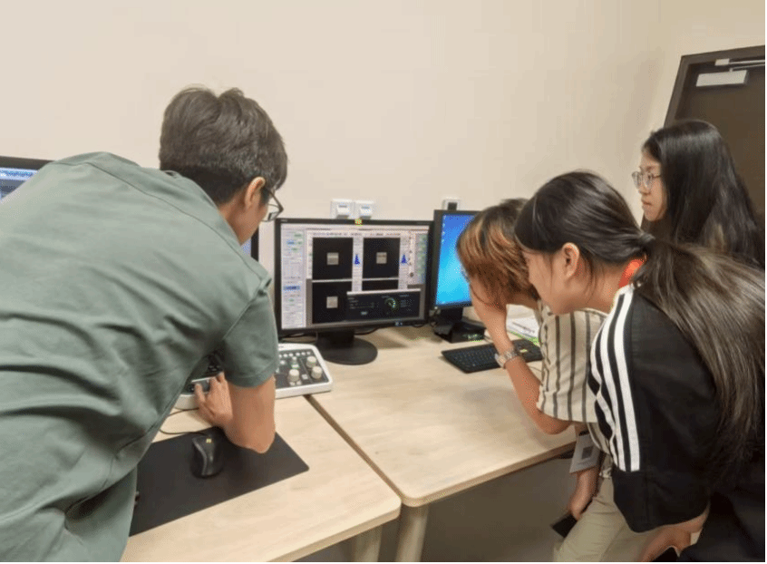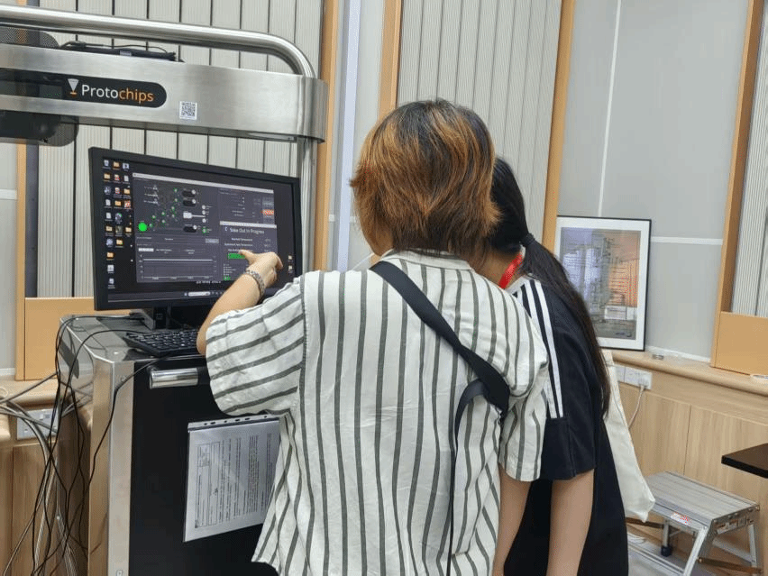 不仅如此,为了让员工能够进一步感受校园科研氛围,7月11日下午,校方组织带领同学们先后参观了了新加坡国立大学的高分子材料实验室和纳米实验室。在负责人介绍下,同学们了解到了目前实验室的研究现状和在研项目,并进入实验室参观电子显微镜并实时操作观察了纳米级别下单层碳原子的排列情况。除此之外,负责人还带领我们认识了全球仅有七台的大型原子探针层析仪。该仪器可以在透射电镜(TEM.)拍摄图像后给出原子的三维排列图像,并通过分析各原子的质荷比来确定是何种元素,从而进一步分析材料。随后,同学们观察和了解到了光子学探针台,电子束刻光仪ML3型微写入器等高精度设备,并在负责人指引下穿好洁净服进入到了无尘室内进一步参观,整个参观过程都让同学们惊叹不已,深刻体会到了科学研究的严谨性,而在负责人指导下进行的仪器操作也让同学们感受到了跨学科知识的融合运用的极大魅力。