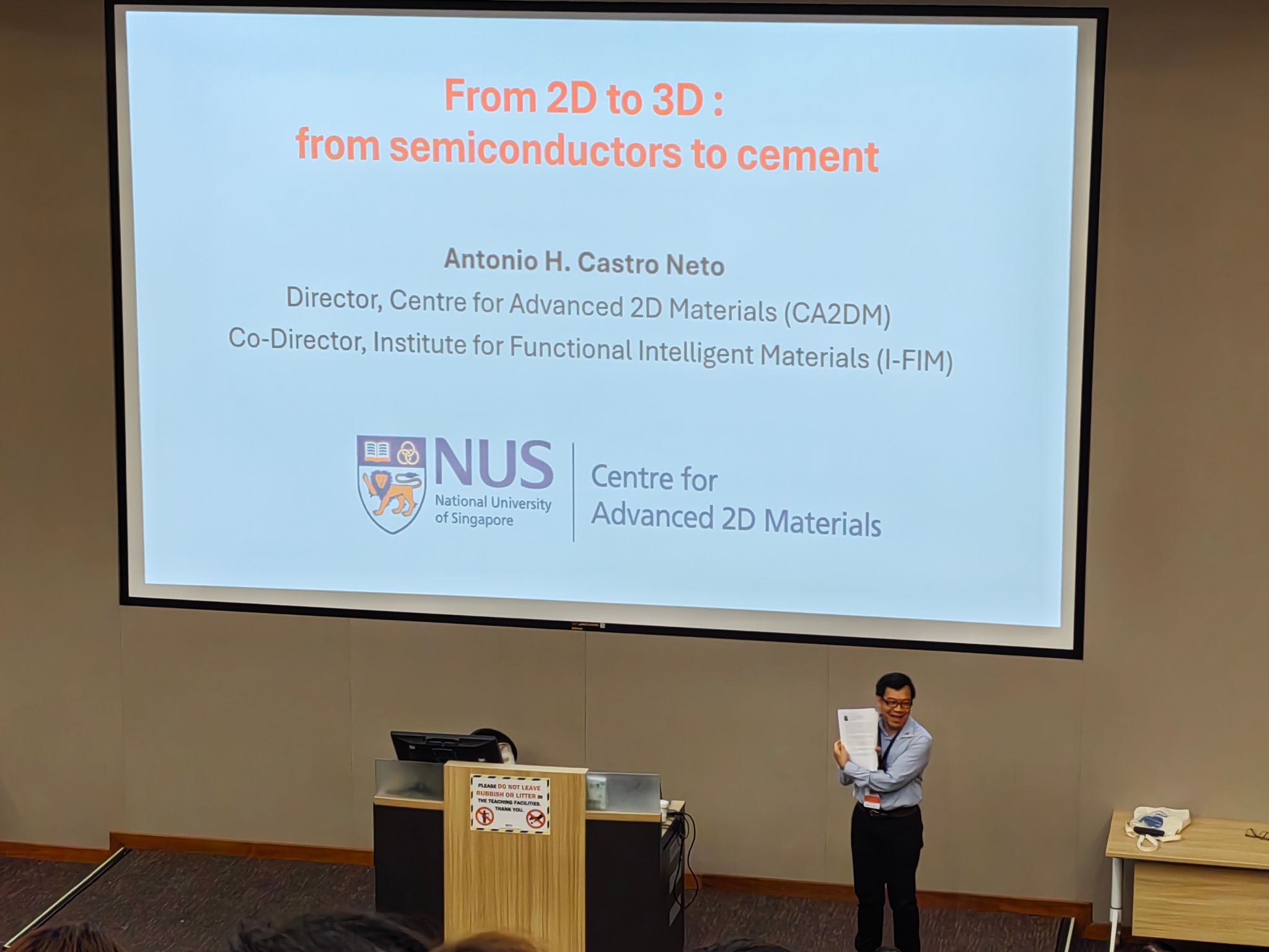 7月8日,清晨的南洋微风裹挟着湿润的花香,新加坡国立大学的校园以葱茏的绿意迎接各位同学的到来。开营仪式上,来自不同国家的学子齐聚阶梯教室,校方代表以“跨界探索,思维无界”为主题,勾勒出研学之旅的蓝图。教授们风趣地分享NUS的学术传统,而破冰游戏中,陌生的名字逐渐化为熟悉的笑脸。当研学手册分发到手,扉页上“用数学解码世界”的标语,悄然点燃了所有人的期待。随后, Antonio Castroneto 教授带来讲座。他从材料科学的角度出发,展示了他团队在海岸防护、可降解餐具等领域的研究成果,这些材料不仅改善了现实生活中的环境问题,也为绿色科技注入了全新动力。现场气氛热烈,各位员工踊跃讨论提问,学术交流氛围浓厚。