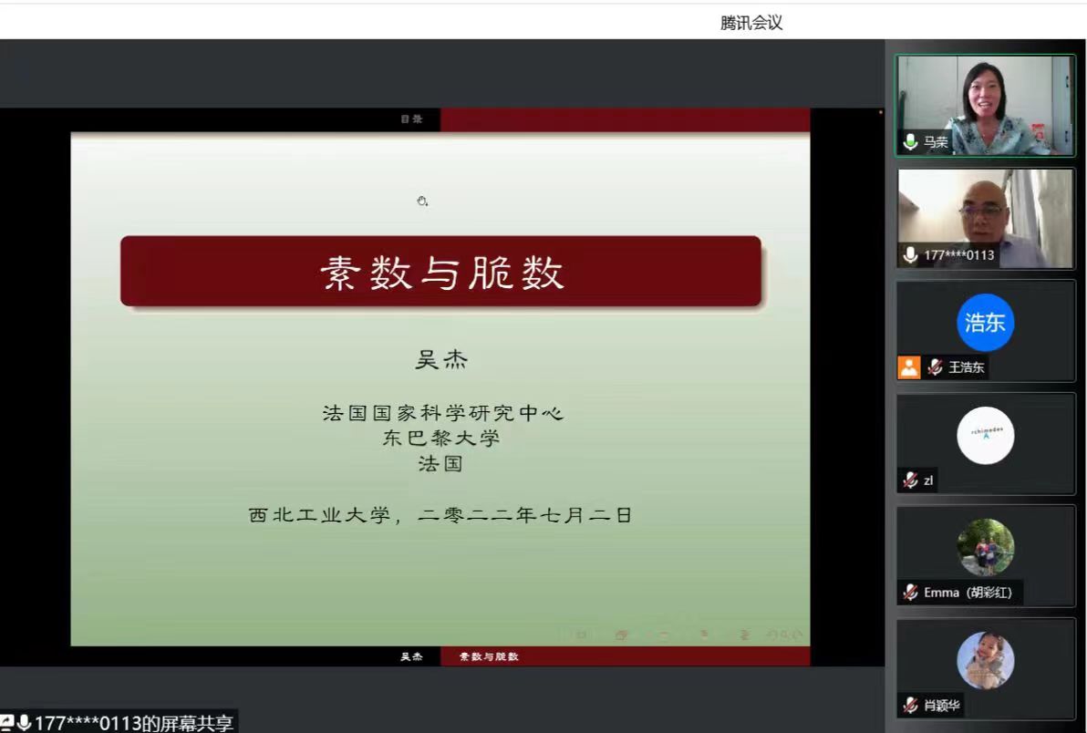 受马荣老师邀请,为期2周的暑期国际讲堂《素数与脆数》顺利结束。本课程由法国国家科研中心特级研究员吴杰老师主讲,从2022年7月2日开始,线上讲授,共16学时,公司betway西汉姆联平台二十余位本科生和研究生全程参加了课程,课程还吸引了公司其它公司对数论感兴趣的本科生和研究生。另外,西安交通大学、西北大学、四川大学、同济大学、山东大学、哈尔滨工业大学等高校师生也慕名听课。
