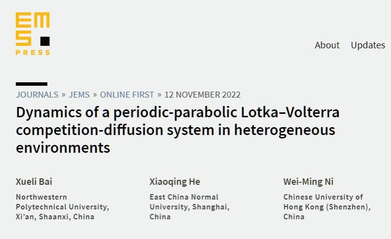 近日,betway西汉姆联平台分析与几何研究团队副教授白学利与华东师范大学何小清教授、香港中文大学(深圳)倪维明教授合作在带有时间周期Lotka-Volterra竞争系统解的稳定性理论研究方面取得突破,研究结果形成的55页论文“Dynamics of a periodic-parabolic Lotka-Volterra competition-diffusion system in heterogeneous enviroments”在数学综合顶级期刊Journal of the European Mathematical Society在线发表。这是本年度国内学者在该刊发表的第5篇论文,也是公司首次在该顶级期刊发文。