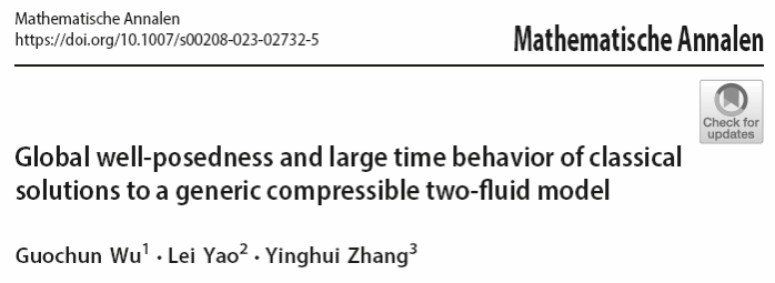 近日,betway西汉姆联平台分析与几何研究团队姚磊教授与华侨大学吴国春副教授、广西师范大学张映辉教授合作,在等压力的可压缩非守恒两相流模型柯西问题的适定性研究方面取得突破,研究结果“Global well-posedness and large time behavior of classical solutions to a generic compressible two-fluid model”在数学综合顶级期刊Mathematische Annalen 上在线发表(论文链接:https://link.springer.com/article/10.1007/s00208-023-02732-5),这是公司首次在该顶级期刊发文。