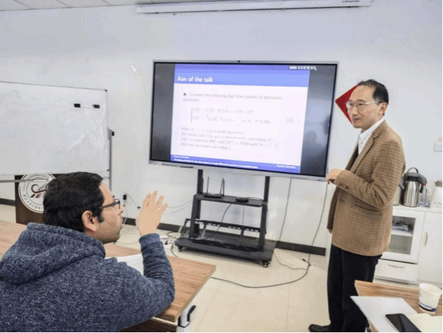报告会上,Inahama教授系统地介绍了粗糙微分方程的背景,粗糙路径理论的相关内容,以及平均原理的核心思想,拓宽了老师与员工的研究思路,也为其他方向的老师员工科普了知识。在受控路径理论的框架下,Inahama教授提出了一类随机粗糙路径和布朗粗糙路径共同驱动的快-慢粗糙微分方程系统的强随机平均原理。