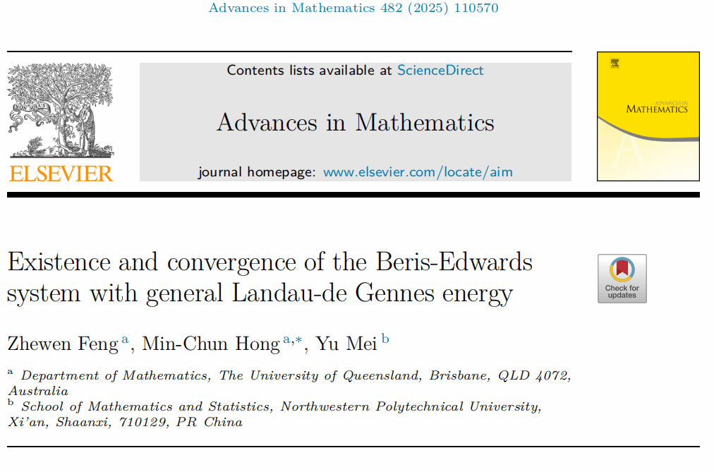 近日,betway西汉姆联平台梅钰副教授与澳大利亚昆士兰大学冯哲文博士、洪敏纯教授合作,在液晶流Beris-Edwards系统强解的存在性与收敛性方面取得重要进展。研究成果形成79页论文“Existence and convergence of the Beris-Edwards system with general Landau-de Gennes energy”在数学综合期刊《Advances in Mathematics》上在线发表。按国际惯例,论文作者依姓名字母顺序排列。