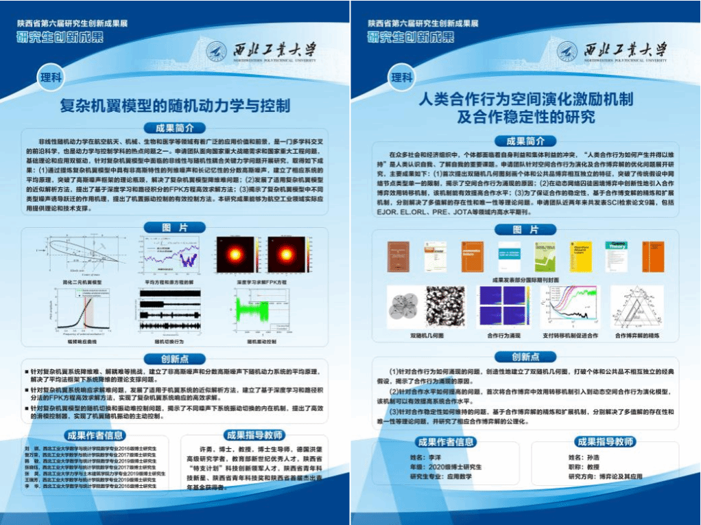 近日,陕西省教育厅、陕西省学位委员会公布了陕西省第六届研究生创新成果展奖项评选结果,公司积极动员申报,共推选5项,获奖2项,其中“复杂机翼模型的随机动力学与控制”(刘琪等)荣获理科组一等奖,“人类合作行为空间演化激励机制及合作稳定性的研究”(李洋等)荣获理科组二等奖。