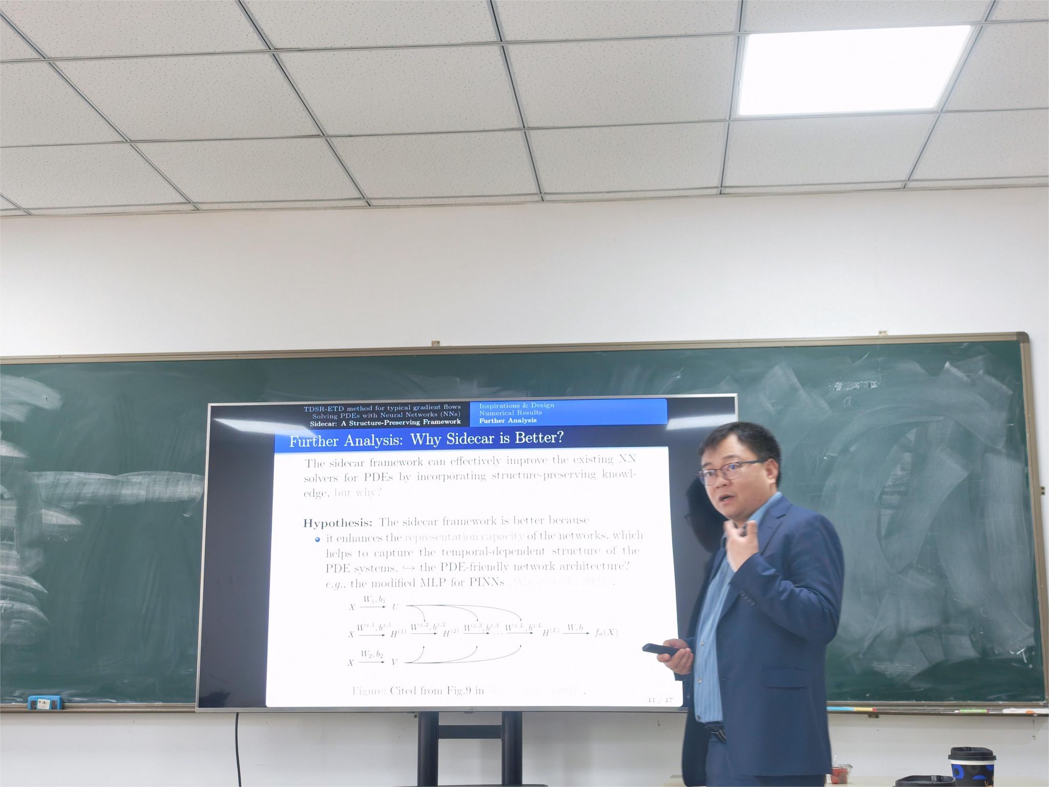 在此次报告中,乔中华教授介绍了一类求解偏微分方程的保结构神经网络方法。他首先阐释了求解梯度流问题的TDSR-ETD方法,该方法通过引入时间相关的谱正则化因子实现了保能量耗散性质。基于此创新思路,研究团队在现有神经网络基础上构造了求解TDSR因子的辅助网络,并通过数值算例展示了新网络结构不仅具有保结构性质,还可以提高数值解的精度。