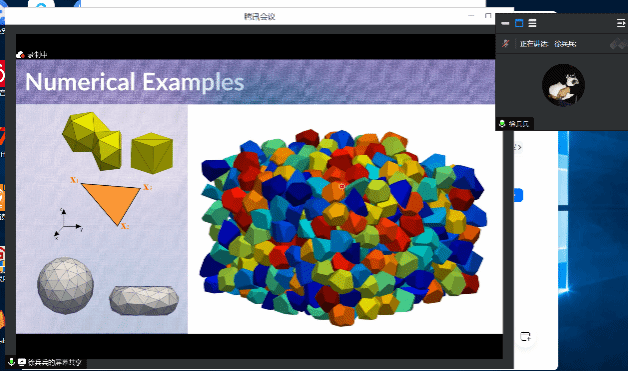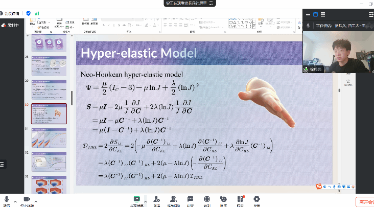 在报告中,徐兵兵首先以泊松问题和线弹性问题为例详细说明了虚单元方法的构造过程。随后,从工程应用的角度出发,他提出了一种无稳定项的三维虚单元方法,并介绍了这类方法以及它的高阶形式在一系列非线性问题上的应用,包括具有大变形的超弹性问题、弹塑性问题、接触问题、相场断裂问题等。最后,徐兵兵简单介绍了三维情况下任意多面体网格的生成方法以及当前虚单元方法的软件发展等内容。报告结束后,徐兵兵就报告内容与参会的师生展开了详细的交流和讨论。