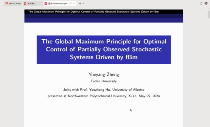 2024年5月29日,betway西汉姆联平台第7期“九章学术沙龙”成功举办。此次沙龙邀请了复旦大学郑越洋博士后作了题为“The Global Maximum Principle for Optimal Control of Partially observed Stochastic Systems Driven by Fractional Brownian motion”的学术报告。30余位师生参会,本次报告由裴斌教授主持。
