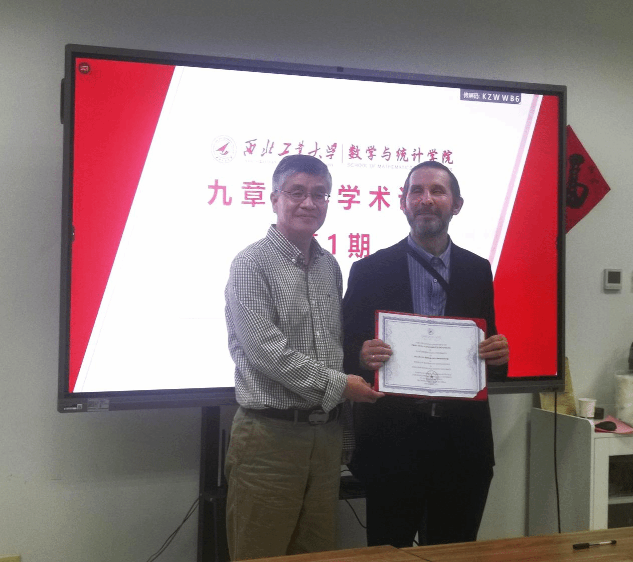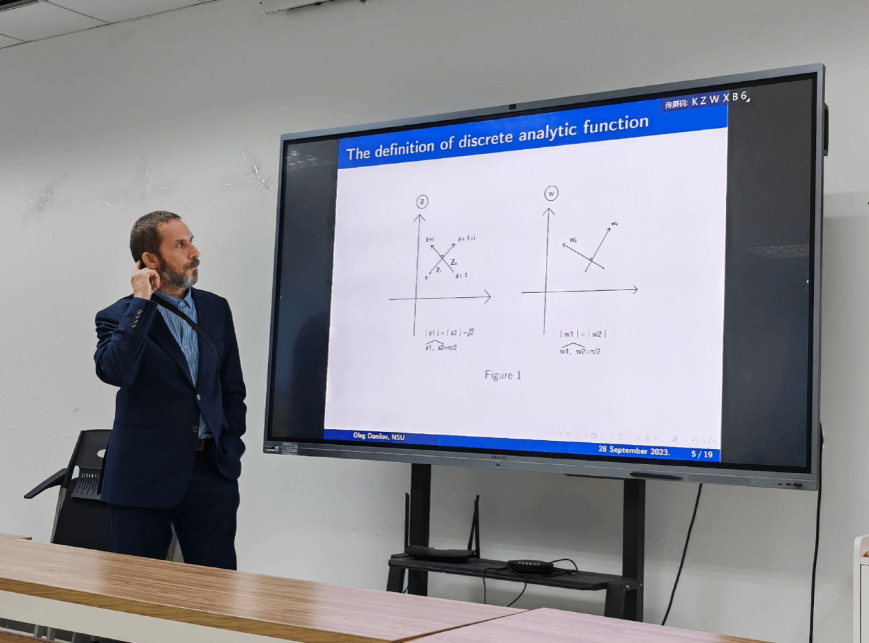 首先,肖曼玉对于Oleg Danilov进行了简要介绍,表达了对于教授来访的热烈欢迎与期盼,希望通过本次交流切实推进双方在科学研究与员工培养方面的合作。接下来,Oleg Danilov作了题目为《Discrete analytic functions in complex spaces and Taylor expansion》的报告,他围绕解析函数新的组合和分析的思想,将离散解析函数加以阐释与推广,并给出自己的新结论并加以证明。最后,参会师生与专家就感兴趣的问题进行了深入讨论与交流,聂玉峰向Oleg Danilov颁发了“九章荣誉教授证书”。