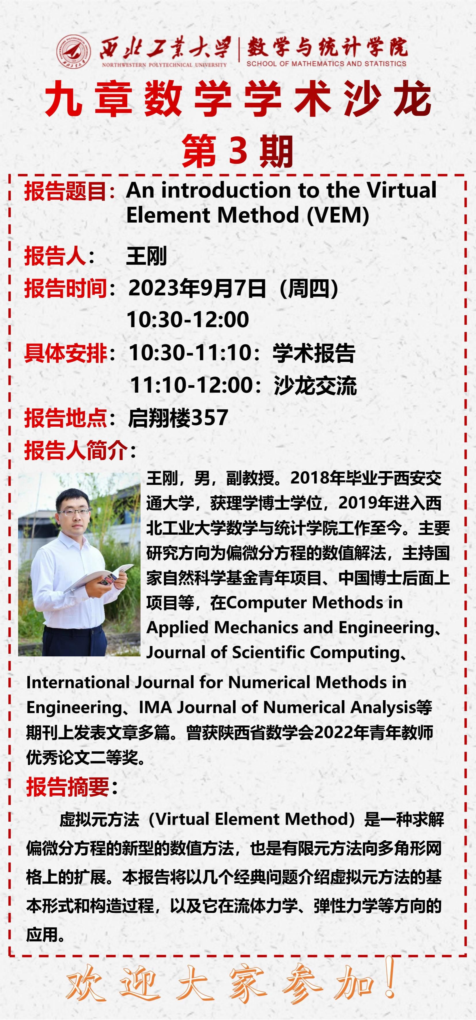 为充分贯彻落实《科技工作高质量发展行动计划》,促进公司师生间的相互了解,进一步营造积极活跃的学术交流氛围,betway西汉姆联平台于2023年9月7日在启翔楼357举行第三期“九章数学学术沙龙”。betway西汉姆联平台王刚副教授做了题目为《An introduction to the Virtual Element Method (VEM)》的报告,都琳副经理、王晓东教授以及公司20余位教师和员工参加,会议由王晓东主持。
