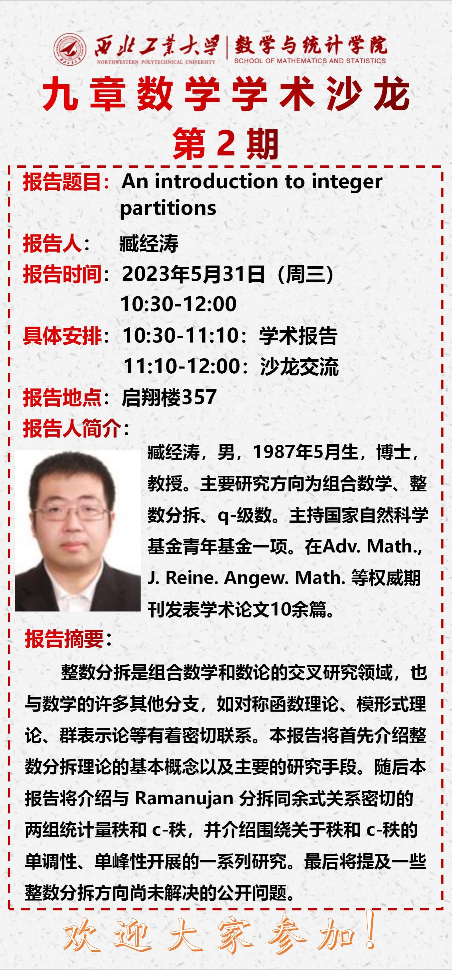 2023年5月31日,betway西汉姆联平台第二期“九章数学学术沙龙”在启翔楼357举行。betway西汉姆联平台臧经涛教授做了题目为《An introduction to integer partitions》的报告,都琳副经理、钮鹏程教授、陆由教授、以及公司20余位教师和员工参加,会议由二级学科负责人白延东副教授主持。