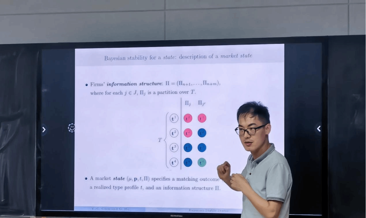 虎高计副教授以婚姻市场、就业市场和招生市场等经典匹配问题为例,介绍了不完全信息的双边市场匹配问题,定义了由匹配和信息结构组成的市场状态及其贝叶斯稳定性,扩展了Liu(2020) 的贝叶斯稳定性概念。报告重点讨论了市场状态的贝叶斯效率及相应贝叶斯稳定性扩展的有效性,说明了市场状态的贝叶斯稳定性可以通过自适应匹配过程的算法实现。