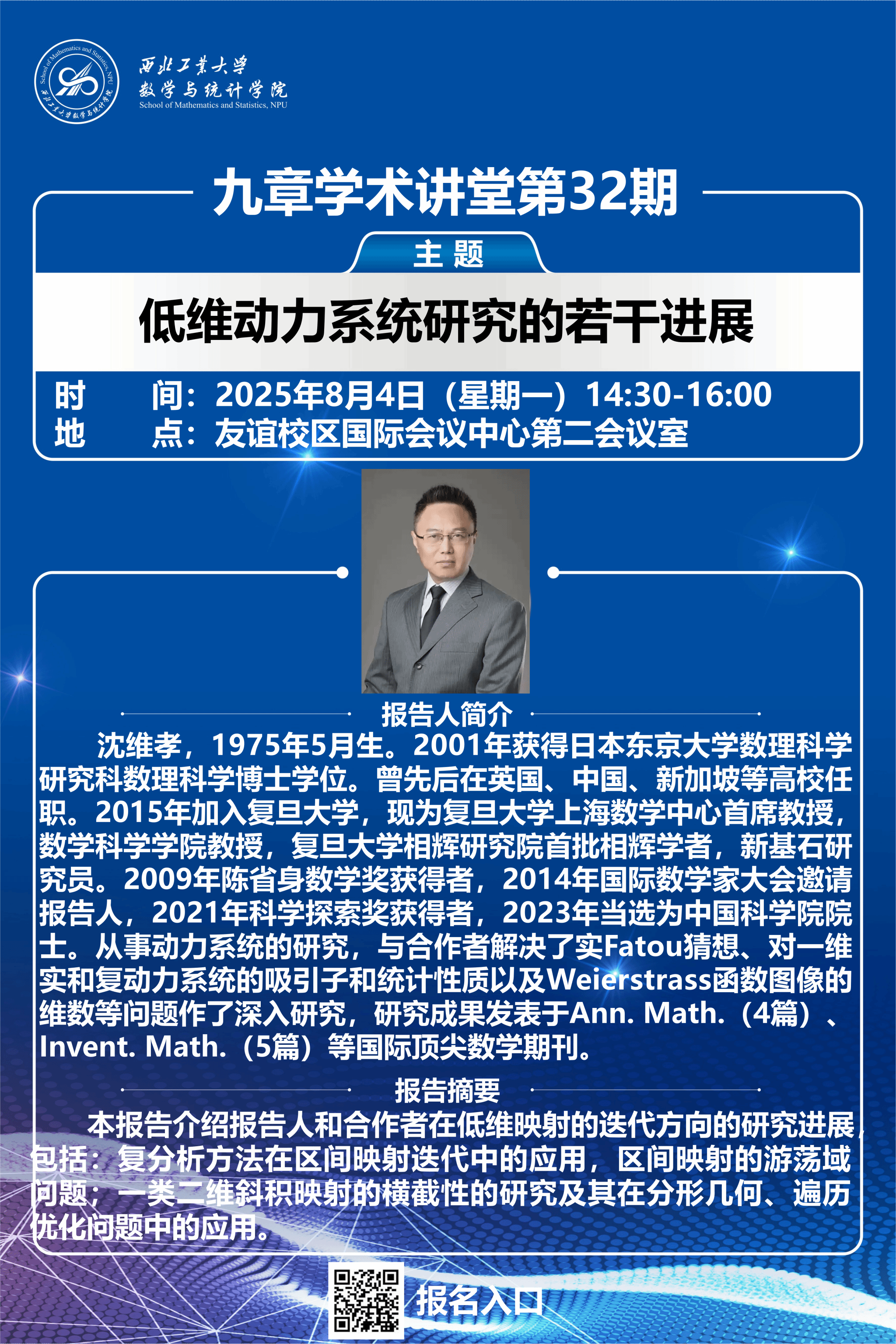 沈维孝,1975年5月生。2001年获得日本东京大学数理科学研究科数理科学博士学位。曾先后在英国、中国、新加坡等高校任职。2015年加入复旦大学,现为复旦大学上海数学中心首席教授,数学科学公司教授,复旦大学相辉研究院首批相辉学者,新基石研究员。2009年陈省身数学奖获得者,2014年国际数学家大会邀请报告人,2021年科学探索奖获得者,2023年当选为中国科公司院士。从事动力系统的研究,与合作者解决了实Fatou猜想、对一维实和复动力系统的吸引子和统计性质以及Weierstrass函数图像的维数等问题作了深入研究,研究成果发表于Ann. Math.(4篇)、Invent. Math.(5篇)等国际顶尖数学期刊。