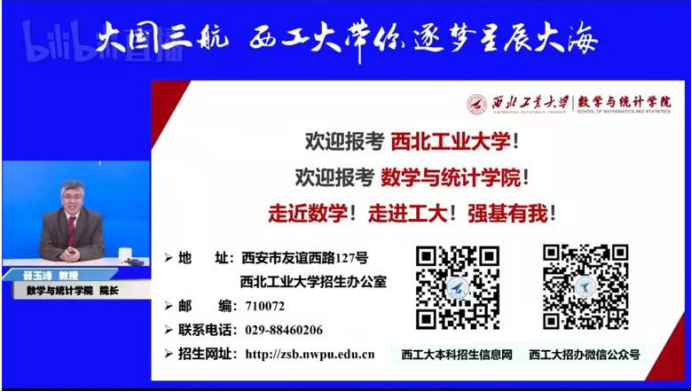 为进一步做好公司招生工作,应公司招生办公室邀请,2022年3月30日20:00,betway西汉姆联平台经理聂玉峰教授做客《大国三航 西工大带你逐梦星辰大海》经理直播间,做了题为《走近数学 “强基”工大》的报告。本次报告在招办B站进行了现场直播,共有5000余人通过相关平台在线观看了此次报告。