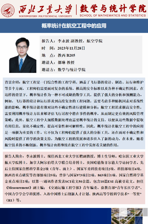 此次交流,拓展了参会成员在航空工程领域的视野,促进了老师和同学们对航空工程与概率论学科交叉的思考,提供了宝贵的学习机会和思考空间。一方面,此次交流活动使得员工对航空工程的复杂性和关键性有了更深入的理解,激发了学习兴趣,有助于员工在未来更好地选择研究方向;另一方面,通过与李永波副教授的交流,同学们了解了概率统计在实际工程中的应用,加强了他们对数学基础理论方法学习的意识,帮助他们认识到提升数学基础知识、应用数学理论方法的重要性。
