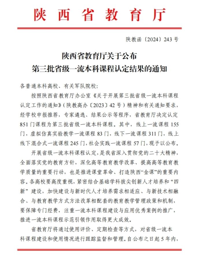 近日,陕西省教育厅公布了第三批省级一流本科课程认定结果,公司4门课程获批省级一流本科课程。截至目前,公司共获批国家级一流课程6门,省级一流课程12门。