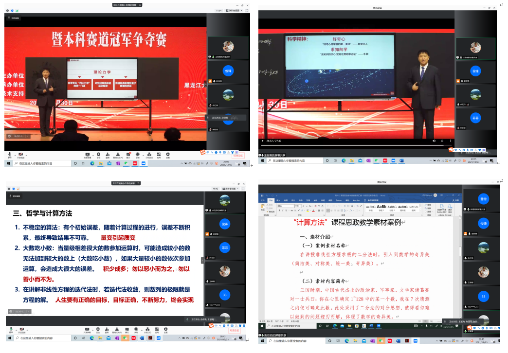 计算方法课程团队线上召开了课程思政案例交流分享会,经理助理王俊刚、计算科学系副主任王振海以及计算方法课程教学团队相关教师参加本次交流会,会议由课程负责人赵俊锋主持。会议首先学习了黑龙江高校课程教学竞赛本科赛道冠军说课视频以及教学展示,讨论了计算方法课程思政元素融入的途径和方法。随后,赵俊锋、佘红伟和荆菲菲三位教师分享了课程知识点融入思政元素的典型做法。王俊刚和王振海在总结中指出,课程思政要做到“如盐入水”,不能为了思政而思政,大搞形式主义,需要以身作则、强化思政修养,从数学史、算法史、数学哲学、共产党党史等方面汲取营养。