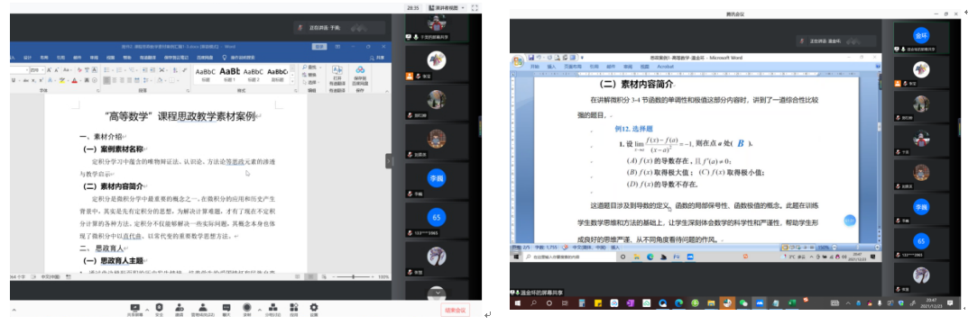 微积分课程团队课程思政素材案例分享交流会共有23位教师在线参加,邀请副经理徐根玖和经理助理郭千桥进行指导,会议由课程负责人张莹主持。张慧、李巍、郜璐璐、于美、郑红婵、温金环、周敏和陈航等8位教师进行了课程思政教学经验和案例分享。徐根玖和郭千桥均对此次交流活动给予了高度评价,表示本次分享会,各位老师通过充分交流,可切实提升课程思政育人能力和实效。