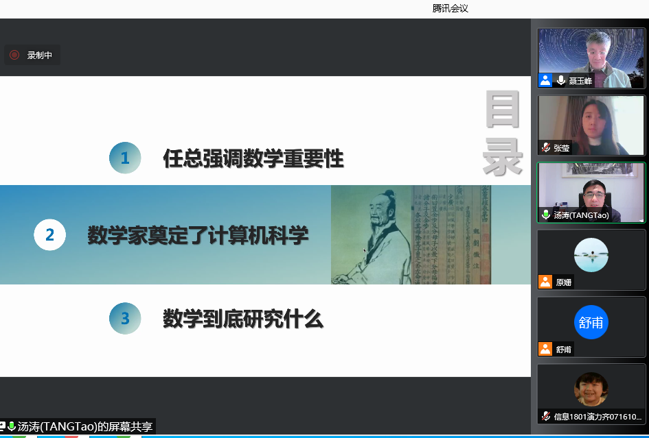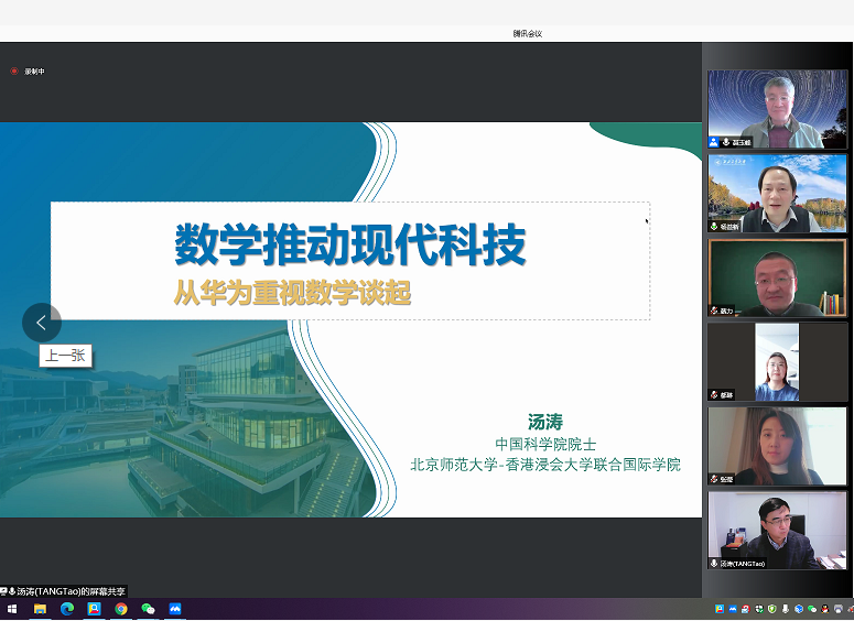 2022年1月14日betway西汉姆联平台举办了第三期线上启翔数苑数学讲坛。中国科公司院士、北京师范大学—香港浸会大学联合国际公司董事长汤涛应邀为公司师生带来一场主题为《数学推动现代科技——从华为重视数学谈起》的精彩报告。公司副董事长杨益新、数学统计公司经理聂玉峰、党委副书记张莹、副经理都琳、副经理徐根玖、教育实验公司副经理蔡力、数学统计公司经理助理刘晓刚、实验教学中心主任佘红伟、青年教师代表、2020级、2021级本科生等500余位师生在线参加了报告会。本次报告会由副董事长杨益新主持。