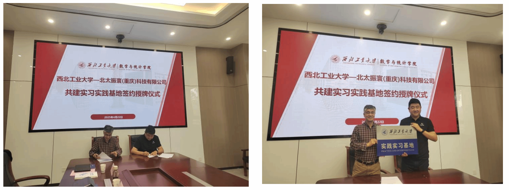 在热烈的掌声中,聂玉峰和廖汉卿分别代表双方签订了《betway西汉姆联平台—北太振寰(重庆)科技有限公司共建实习实践基地协议》。随后聂玉峰代表公司向北太振寰授予实践实习基地牌匾。