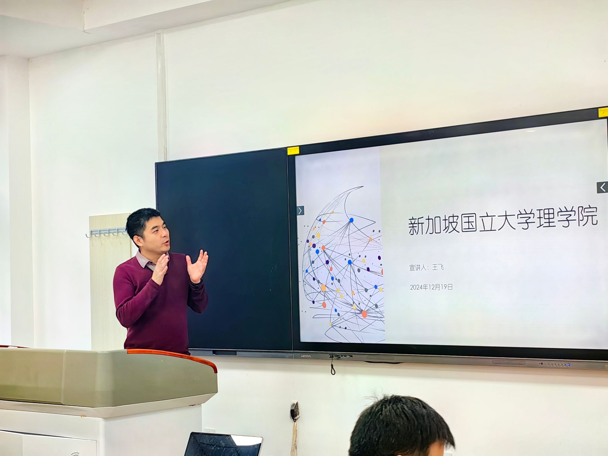随后,王飞教授详细介绍了新加坡国立大学的概况、教育模式、硕博生招生流程,以及理公司的学科背景和学术发展。同学们积极提问,就专业方向选择和出国留学事宜进行了深入交流。王飞教授耐心解答,并鼓励同学们在本科阶段打下坚实的基础,积极探索未来的学术与职业道路。