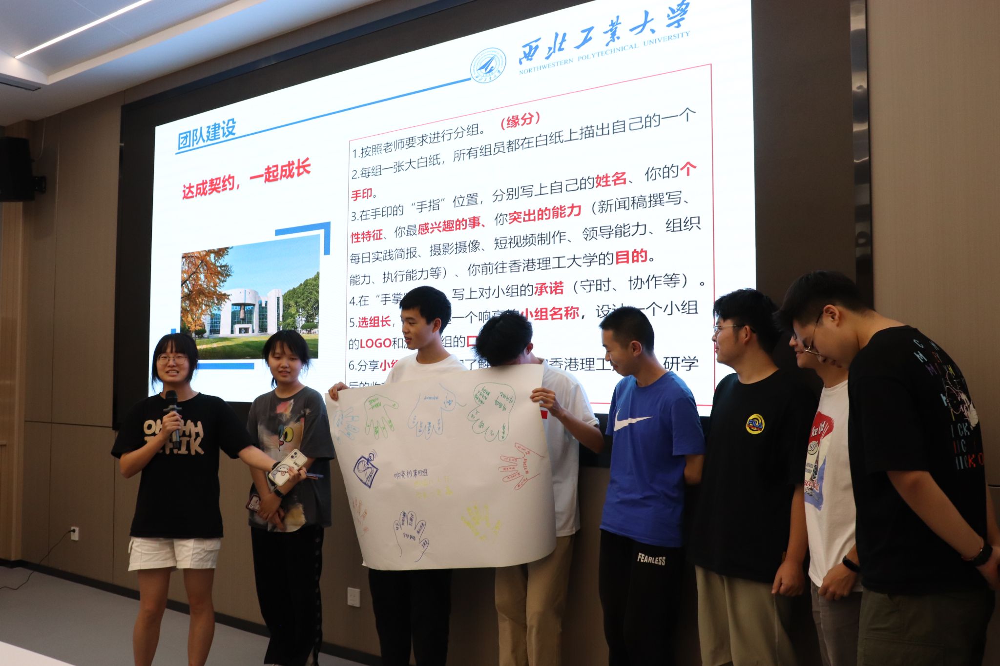 培训会上,王莉书记主要围绕团队意识培养展开核心培训,以“破冰行动”为切入点,带领员工开展团队建设。全体员工共分7个小组,依次完成“手印契约”绘制、小组文化设计等任务——各组成员在空白纸上描下手掌轮廓,于手指位置标注姓名、个性特征及专项技能,在掌心区域共同签署团队承诺。随后,各小组依次展示团队海报,介绍队名、LOGO及口号,并围绕 “香港文化认知”“研学预期收获”进行主题分享。“工大陆战队”“研港先锋队”等小组以海报与生动讲解赢得阵阵掌声,迅速凝聚团队共识,现场气氛热烈。